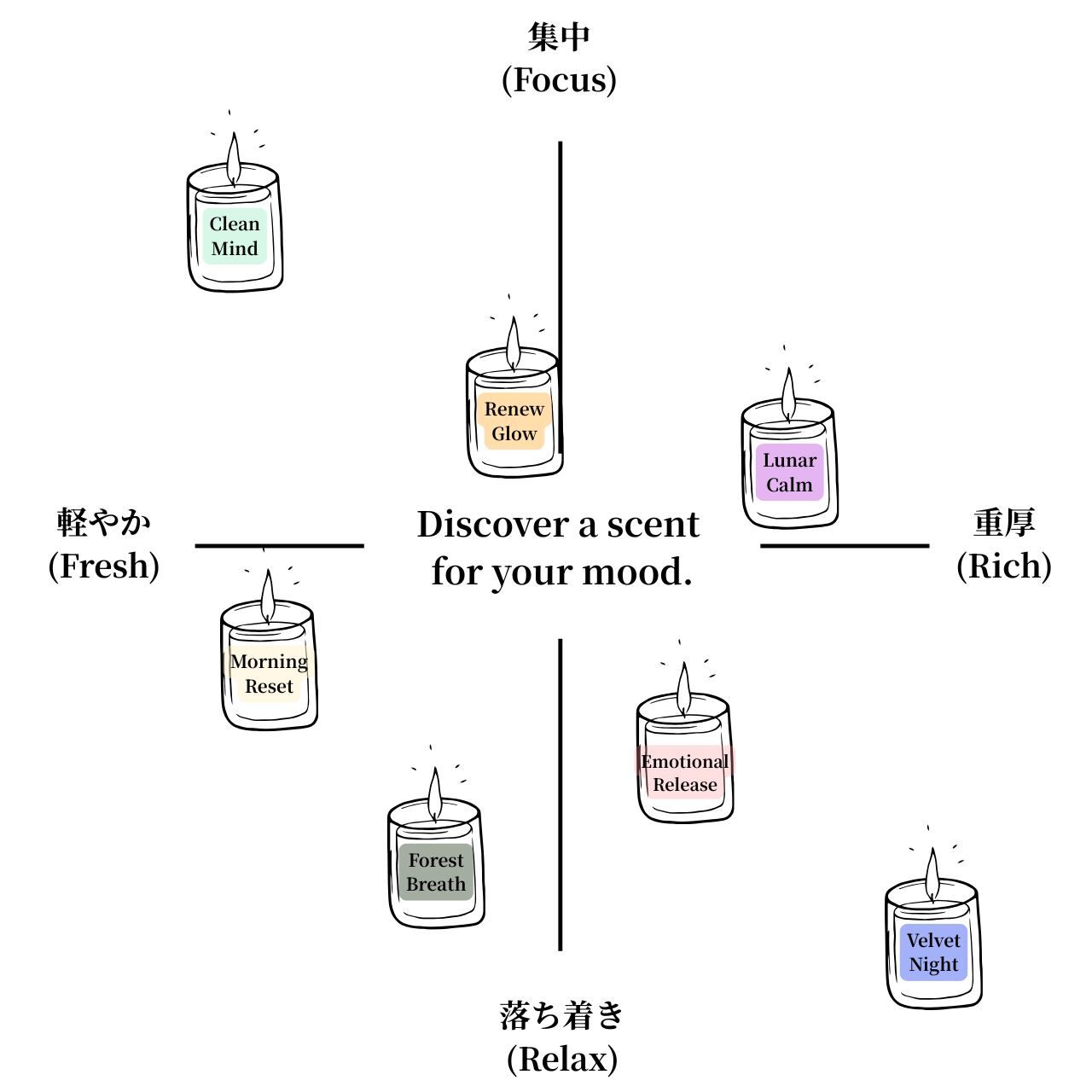 スイートオレンジのやさしい甘さに、ペパーミントのすっきりとした清涼感、パチュリの深みが重なり、朝のだるさを吹き飛ばして、前向きなエネルギーをくれる香り。