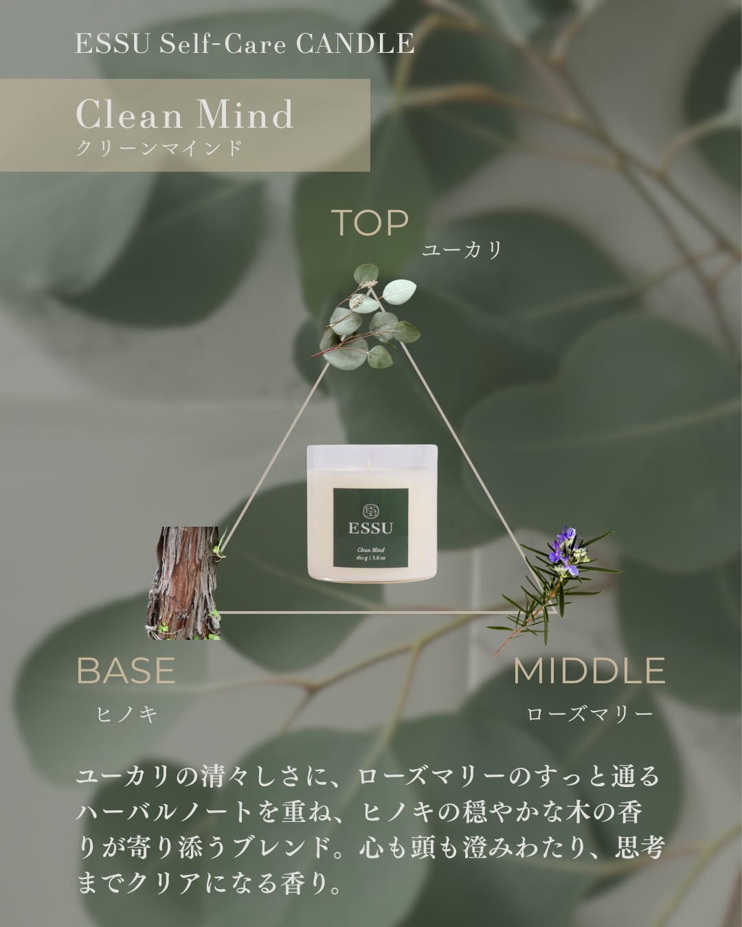 ユーカリの清々しい香りとローズマリーのすっと通るハーバルノートが広がり、ヒノキの穏やかな木の香りがそっと寄り添う。森で深呼吸するように、心も頭もすっきり整い、思考までクリアになる香り。