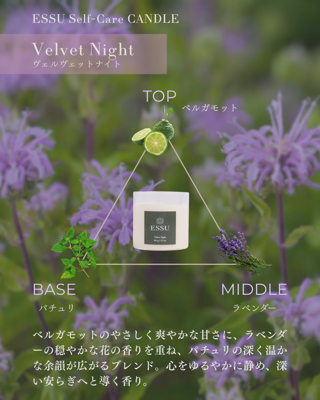 ベルガモットのやさしく爽やかな甘さに、ラベンダーの穏やかな花の香りが重なり、パチュリの深く温かな余韻が広がる。心をゆっくりと静め、眠りへと誘う落ち着いた香り。
