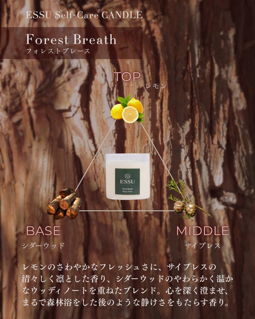 レモンのさわやかでフレッシュな香りに、サイプレスの清々しくすっと通る木の香り、そしてシダーウッドのやわらかく温かみのあるウッディノートが重なり、まるで森の中で森林浴をしているかのように心がすっと澄む香り。
